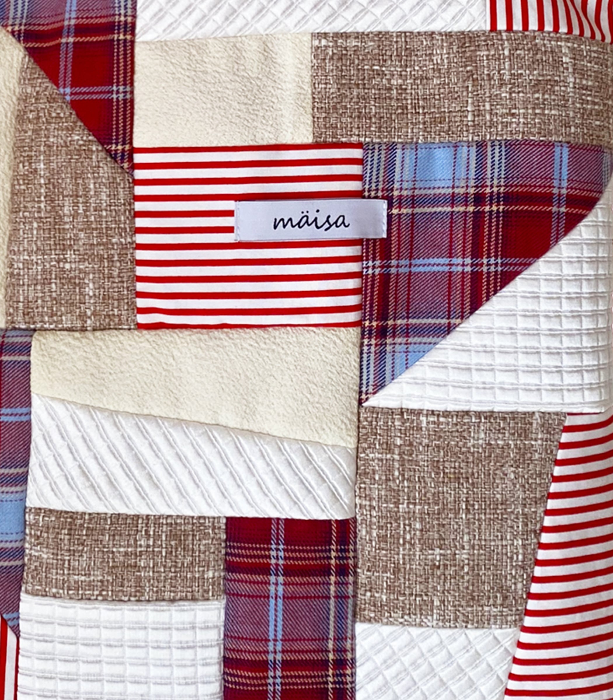 1枚1枚丁寧にカットし繋ぎ合わせ、一つ一つ手作業で製作しました。異素材のパッチワークのデザインが特徴で、ユニークさとお洒落さを兼ね備えたバックです。