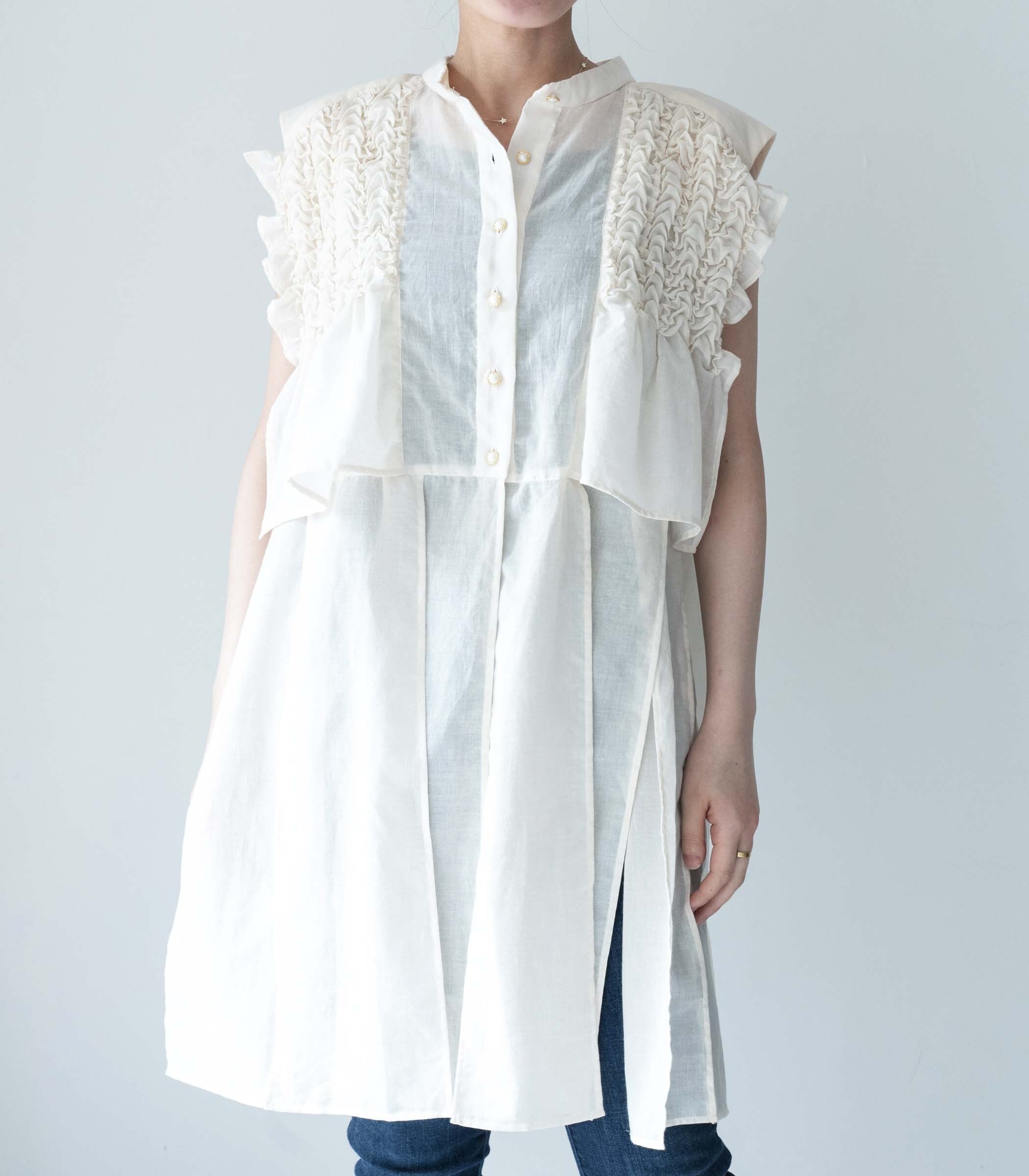 胸元には流れる星をイメージした緻密なスモッキング刺繍、