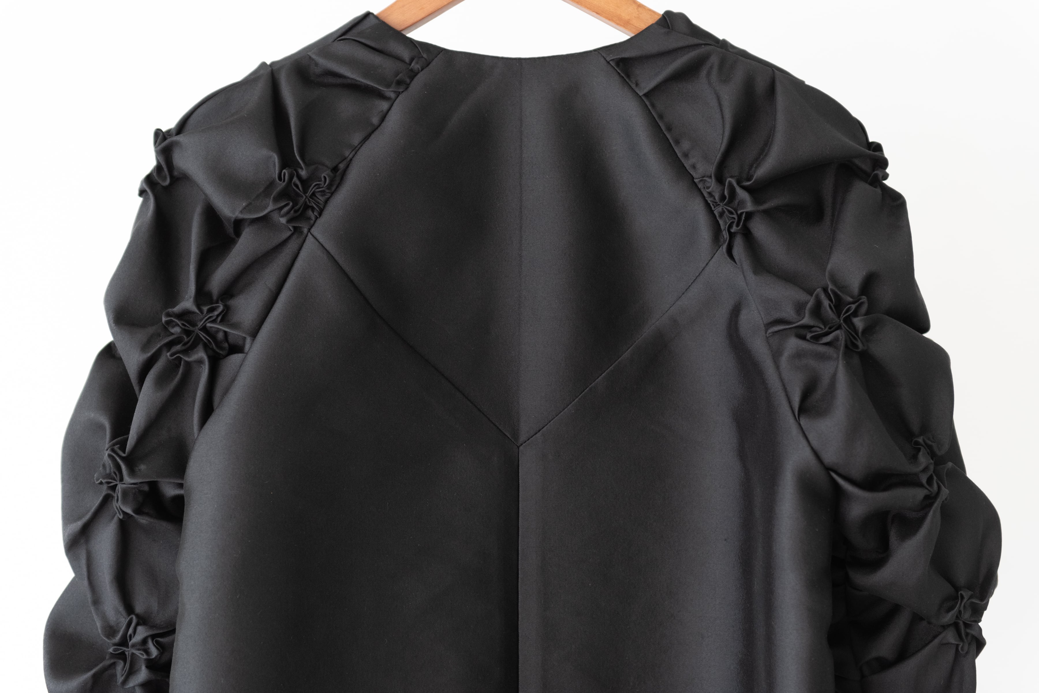 両袖に30時間以上かけスモッキング刺繍を施しました。繊細で立体的なデザインが、上品さと独自性を際立たせます。手作業による丁寧な仕上げにより、他にはない特別な一着となっています。