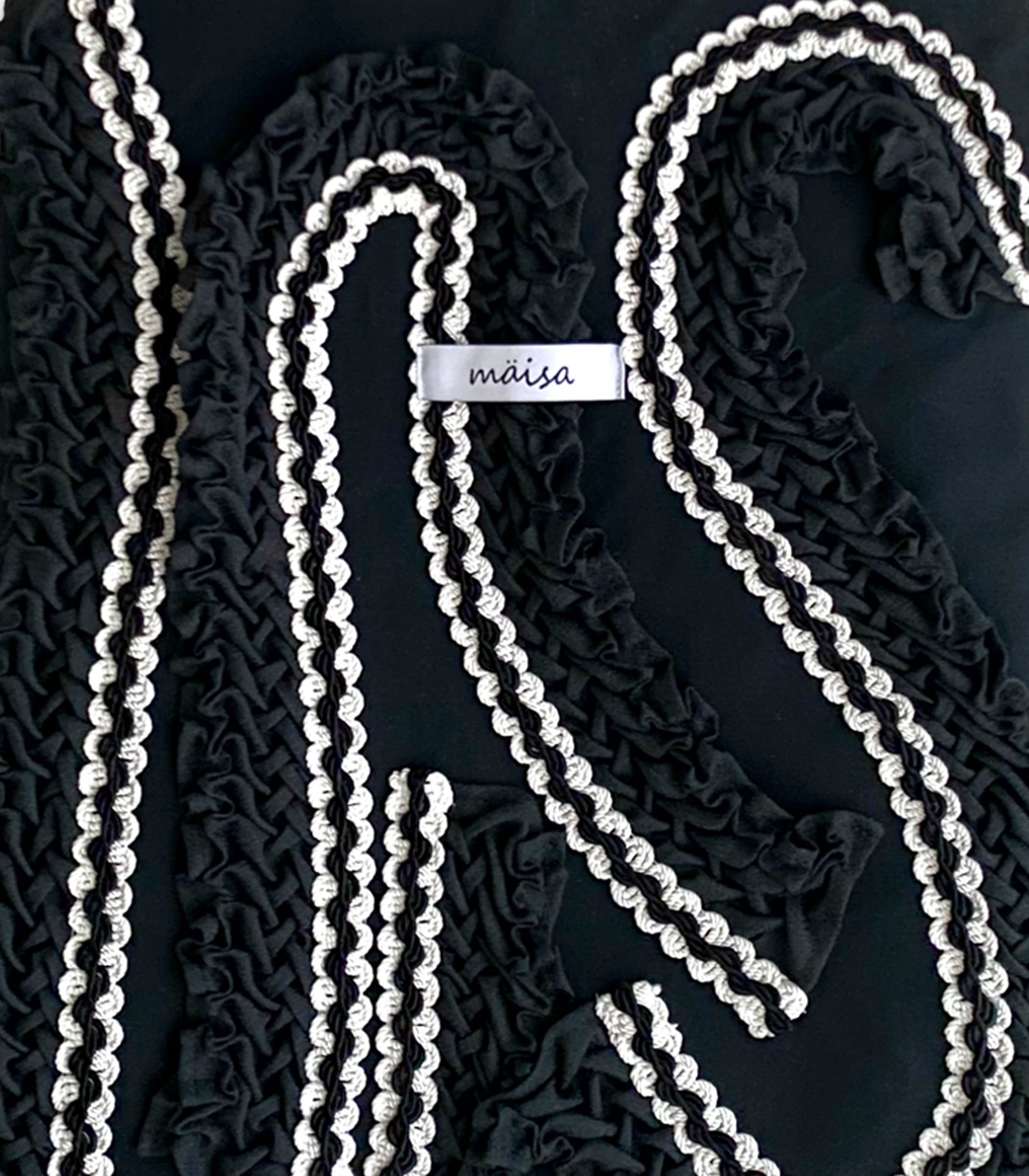 異なる生地に手刺繍のスモッキングを重ね、アーチ状の表情として仕立てています。