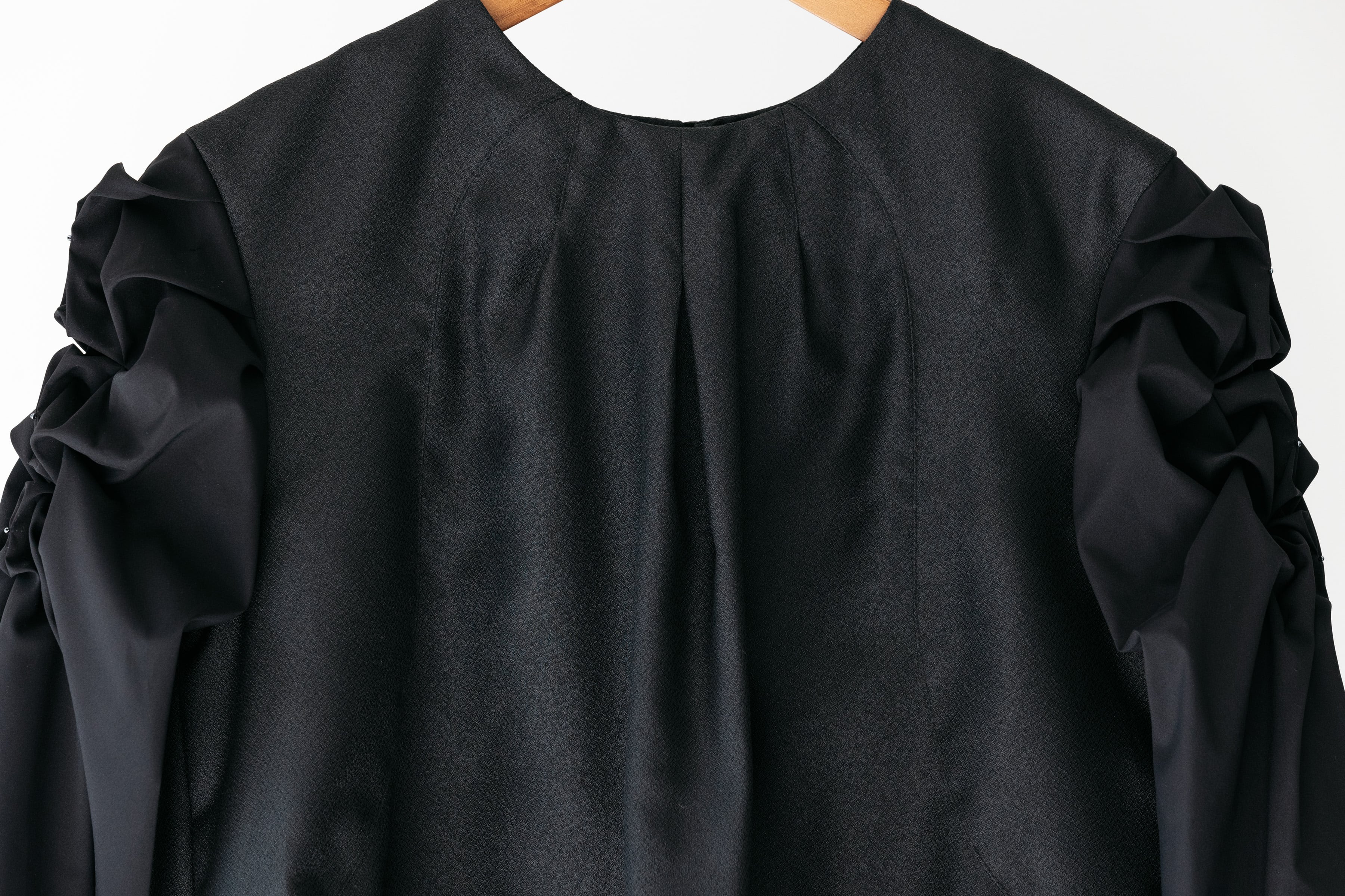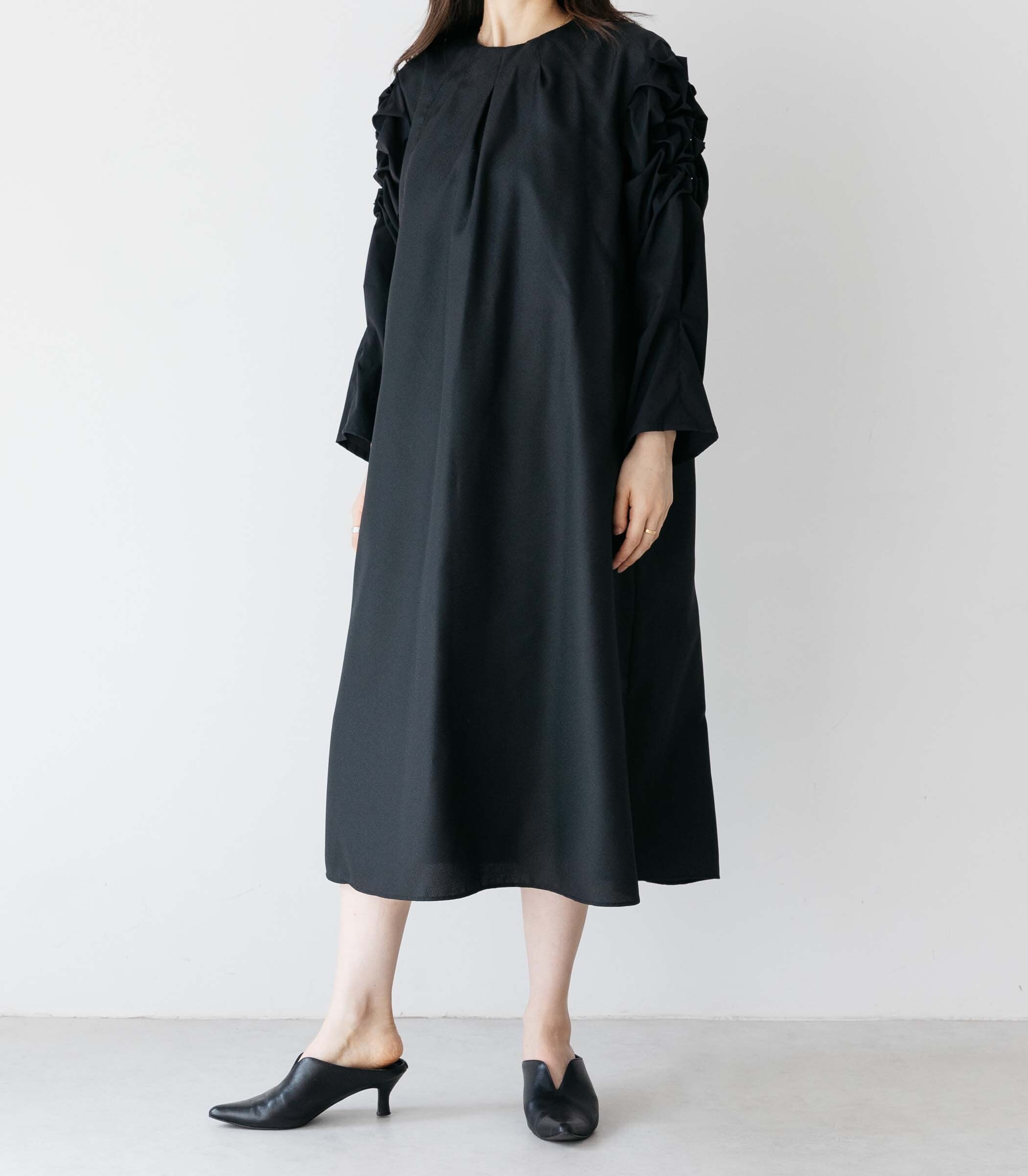 This dress, with its elegant and classic silhouette, features smocking on the sleeves inspired by the flowing shape of an hourglass. While it boasts a bold design, the sophisticated black color exudes a calm beauty, making it perfect for any occasion.